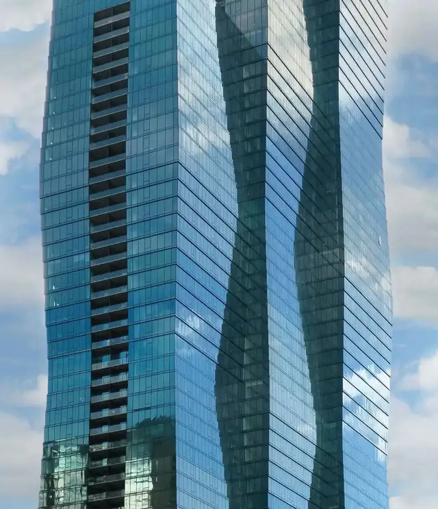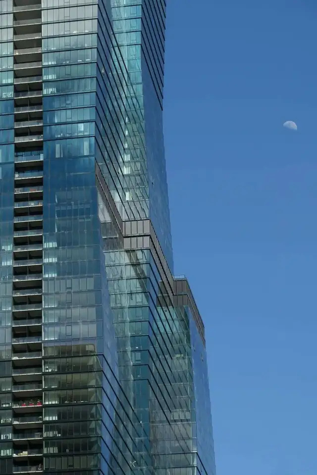 瑞吉大厦不仅是一座超高层建筑,更像是一件流动的艺术品。它坐落在湖岸与步道之间,外形如晶体般层叠交错,灵感来源于萤石的结晶形态。玻璃幕墙随着光线变化呈现细腻的色彩渐变,既优化了日照与通风,也赋予建筑一种诗意的节奏。
